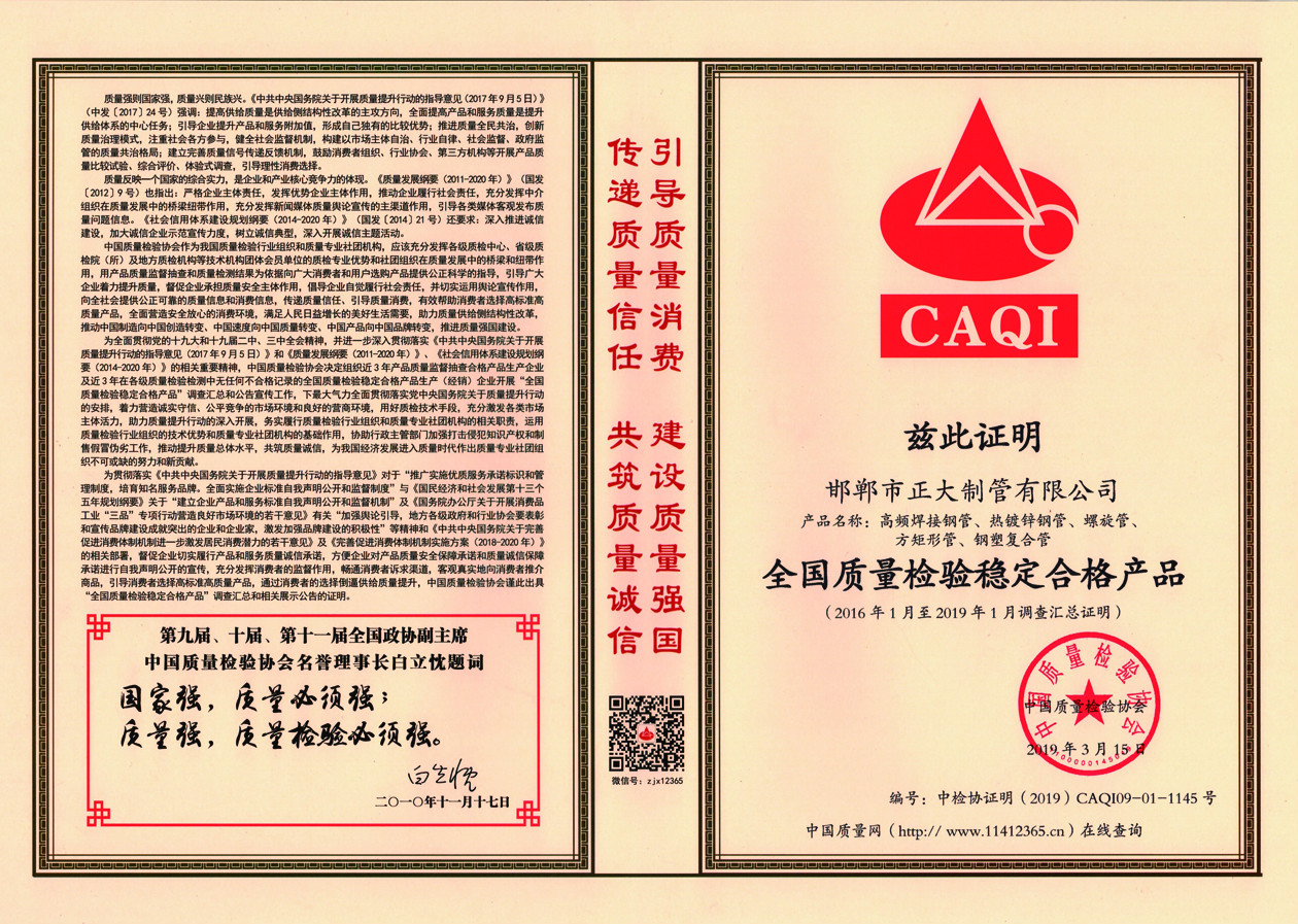 2019年“3.15”國際消費者權(quán)益日,正大制管在中國質(zhì)量檢驗協(xié)會的組織下開展了以“堅持質(zhì)量第一,堅守質(zhì)量誠信;抓好質(zhì)量提升,建設(shè)質(zhì)量強國”為主題的“產(chǎn)品和服務(wù)質(zhì)量誠信承諾”主題活動。榮獲“全國質(zhì)量檢驗穩(wěn)定合格產(chǎn)品”和“全國產(chǎn)品和服務(wù)質(zhì)量誠信示范企業(yè)”兩項榮譽。